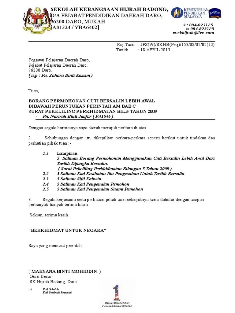 Contoh surat rasmi cuti bersalin resepi book p. Contoh surat mohon cuti bersalin awal have a graphic from . Contoh surat permohonan cuti bersalin awal. Permohonan kemudahan cuti bersalin awal.
